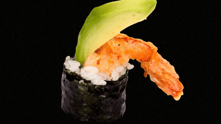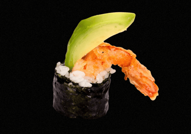 Sushi roll relleno de langostinos en tempura y aguacate con alga nori por fuera