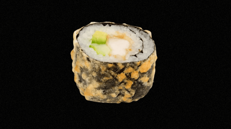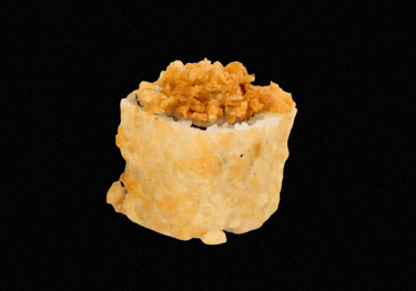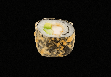 Sushi roll tempurizado relleno de pollo crujiente, pepino y aguacate