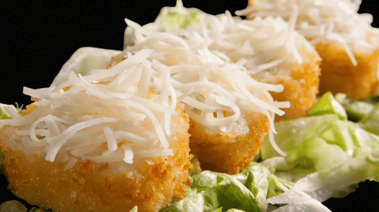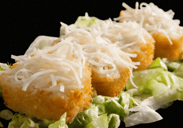 Sushi roll relleno de langostinos, queso crema y aguacate cubierto de panko crujiente con topping de queso rallado