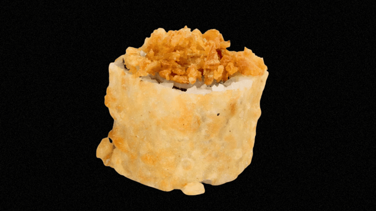 Sushi roll tempurizado relleno de salmón, queso crema y aguacate con topping de cebolla crujiente