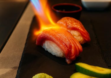 Wagyu A5 de la más alta calidad sobre nigiri, flambeado en mesa para intensificar su aroma, sabor y delicadeza.